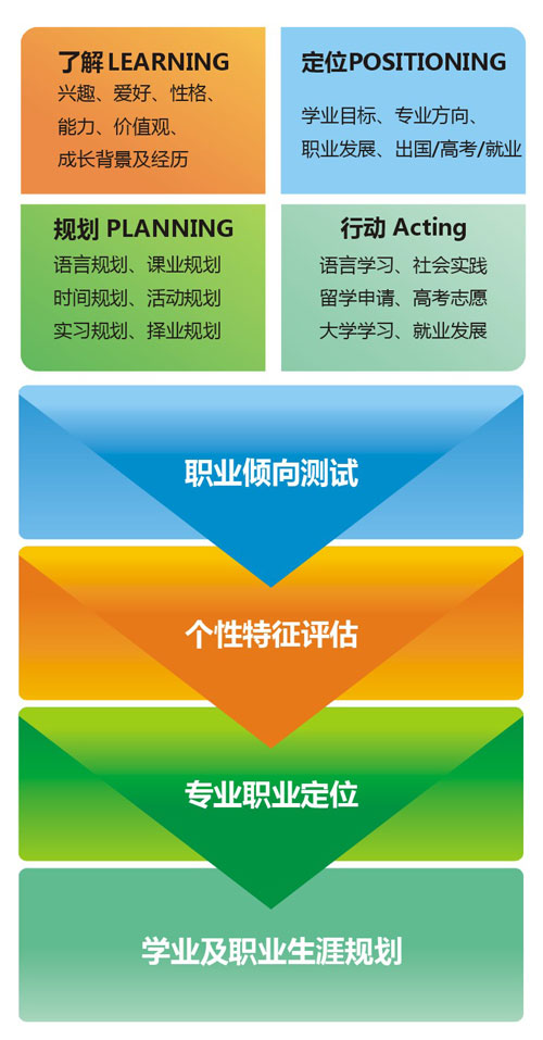 采用国际权威的霍兰德职业兴趣、MBTI人格测试、美国才智能力测评量表,结合中国学员特点,研发出在线测试系统,全面评估兴趣倾向、性格特征、能力结构,帮助确定适合的专业方向及职业领域。