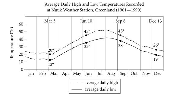 通过阅读划线部分所在的这一句,我们会发现给出的时间是in the winter, 给出的描述对象是average daily low temperatures,那我们就立刻定位到与冬季和average daily low(实线)这个时间段匹配的数据。(如果同学们不清楚格陵兰的冬季是几月,可根据上句进行反推,in summer, average daily high temperatures in Greenland can rise to slightly above 50 degrees Fahrenheit, partially melting the ice,可知7月为夏季,那么12月1月2月则为冬季。)通过信息匹配,可知数据为12,而不是20或10,也不像C选项中提到的在12月13日达到最低点。
