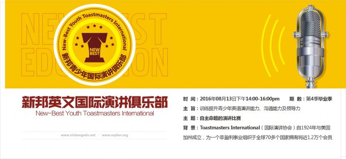 新邦英语国际演讲俱乐部陪伴大家走过了第四季,相信很多加入俱乐部的孩子经过参加4季的10期活动都成长了许多,口语水平、人际交往、团队协作都得到了很棒的提升。让我们用一场淋漓尽致的演讲比赛让俱乐部的每一个成员和新邦的老师见证到你们的这份成长。