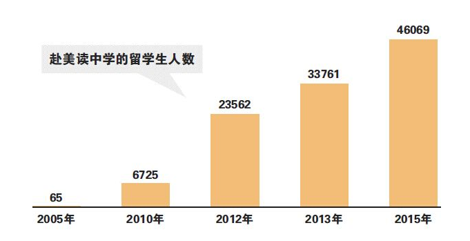 从2005年赴美读中学的总体人数65人到2015年赴美读中学的总体人数上涨到46069人,短短十年间,出国读中学的学生人数上涨700倍。留学低龄化趋势日趋显著。