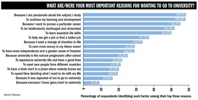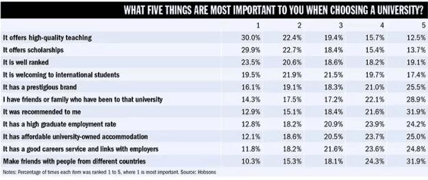 根据调查结果显示:排名前五的因素分别是教学质量好(High quality Teaching);提供奖学金;排名好;欢迎留学生;声誉好。其中教育质量以30%的比例位列首位,其次是奖学金和排名,而排名占到23.5%,由此可见,现在学生在选择院校时开始更加理智。不再盲目追求排名的高低,而是