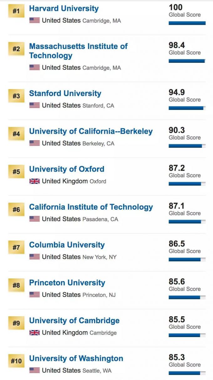 此次排名中,哈佛大学稳居第一,MIT、斯坦福紧随其后,加州伯克利排在第四,牛津大学第五名,加州理工第六名,哥大第七名,普林斯顿第八名,剑桥大学排在第9,第10名为华盛顿大学。